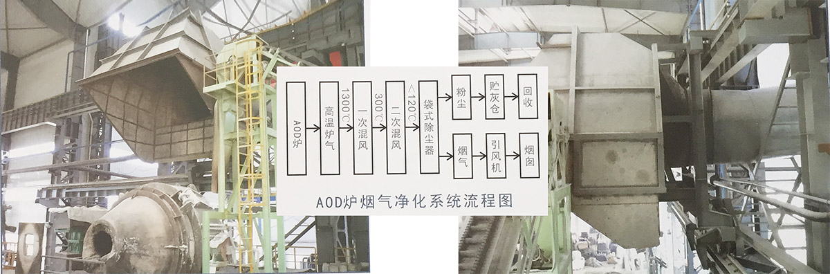 煉鋼過(guò)程中基本的一點(diǎn)是吹氧脫碳, 而不銹鋼冶煉技術(shù)的關(guān)鍵在于脫碳保鉻, AOD爐就是通過(guò)吹入惰性氣體,降低鋼液 中形成的CO氣泡分壓來(lái)實(shí)現(xiàn)脫碳保鉻的。 AOD爐在脫碳精煉過(guò)程中,由于鋼水中碳 的氧化和吹入惰性氣體Ar或N2,AOD爐產(chǎn)生 的爐氣溫度高達(dá)1300°C,含塵量為65g/m3, CO的含量約55%,為了保護(hù)環(huán)境,改善工 人工作條件,必須對(duì)高溫?zé)煔膺M(jìn)行治理, 使凈化后的煙氣質(zhì)量符合規(guī)定的排放 標(biāo)準(zhǔn)。