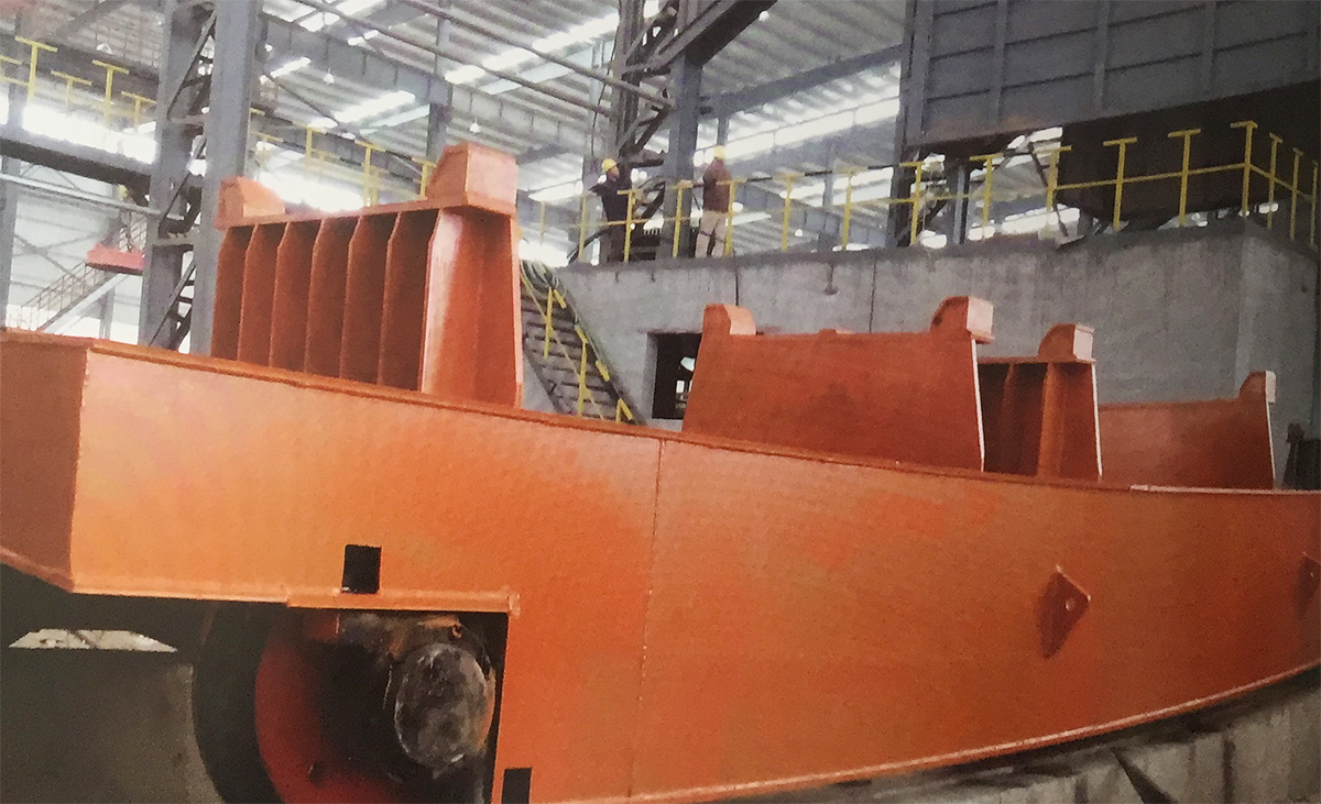 鋼包車裝置由鋼包車體、傳動裝置、車輪、鋼包導向座以及拖纜裝置和軌道清理器等組 成。由鋼板和型鋼組焊成的矩形梁構成框架式的車體,車體在四個角上設有加強支撐,由電 動機經聯軸器帶動減速器傳遞到兩個車輪上,驅動鋼包車運行,鋼包車共設四個車輪, 雙驅動裝置,各車輪裝在軸承座上,輪子前端設有軌道清理器,以清除軌道面上的散落物。
